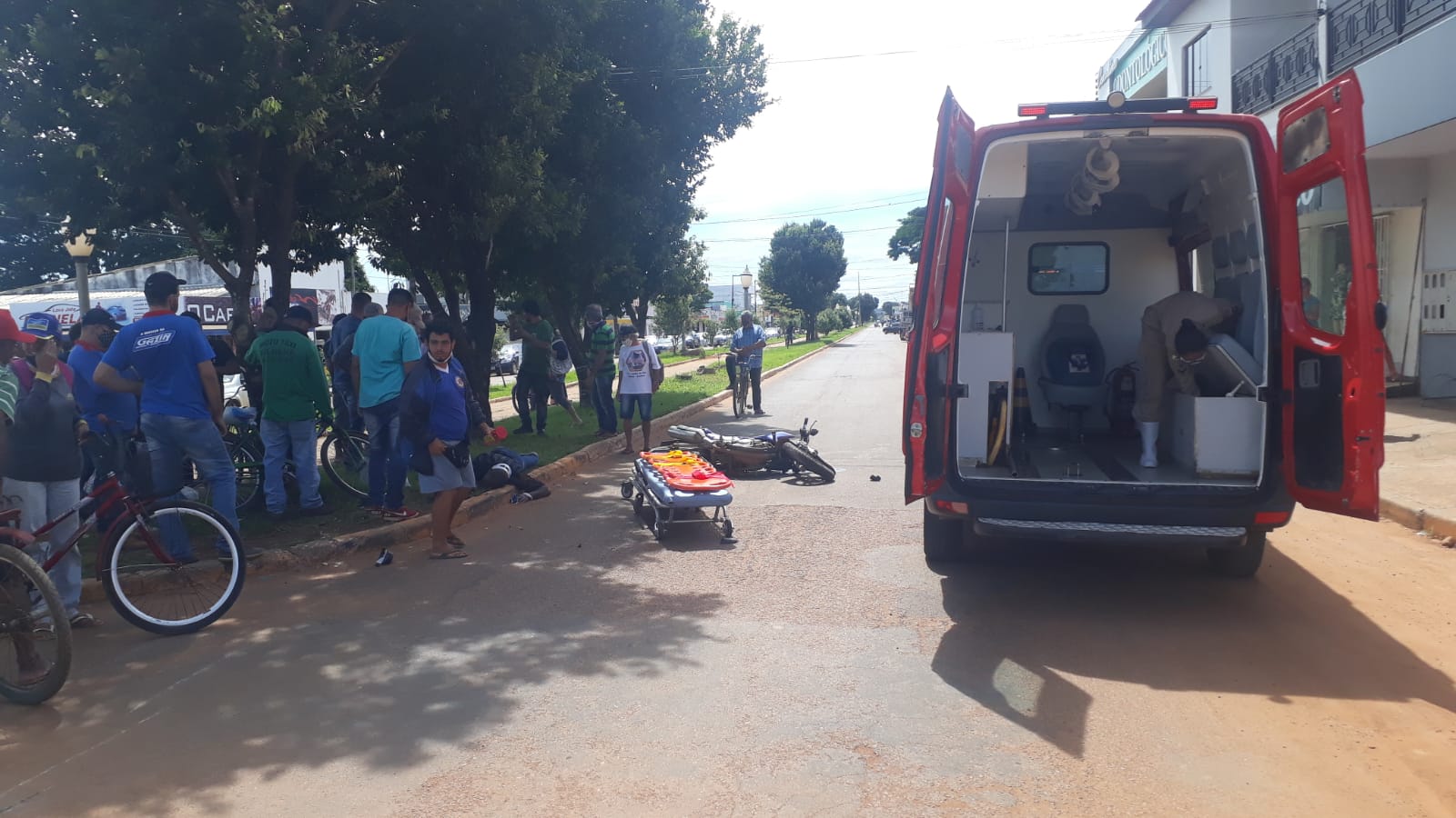 Neste momento, o motociclista que pilotava uma Yamaha Fazer 250 de cor azul e transitava logo atrás, quando tentou ultrapassagem em cruzamento e acabou atingindo a motoneta.