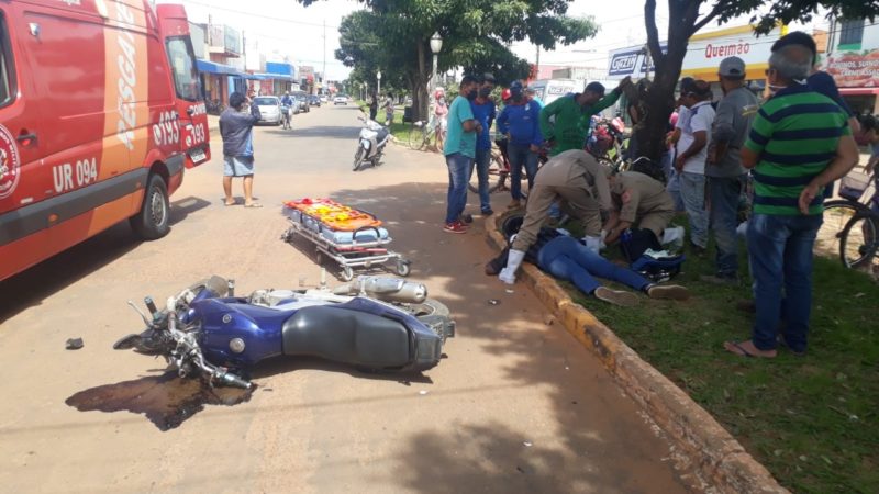 Neste momento, o motociclista que pilotava uma Yamaha Fazer 250 de cor azul e transitava logo atrás, quando tentou ultrapassagem em cruzamento e acabou atingindo a motoneta.