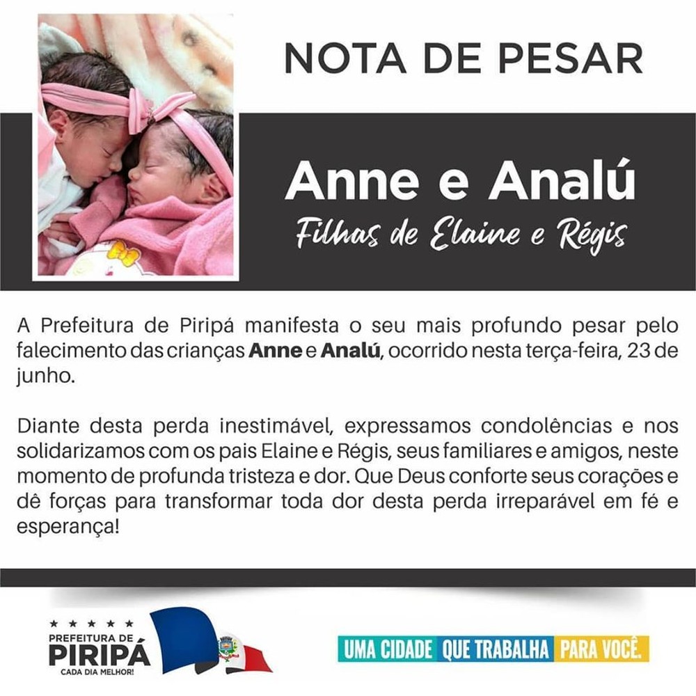 O caso ainda não teve registros na delegacia do município. O choque na cidade foi tamanho que até a Prefeitura Municipal emitiu uma nota oficial prestando condolências se solidarizando com os papais e os familiares das crianças em um momento de imensa tristeza e dor.