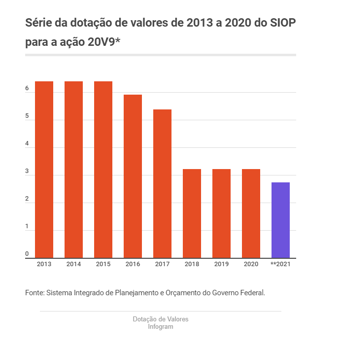 Segundo dados do Projeto de Lei Orçamentária 2021 que vieram a público no início desta semana, o orçamento destinado à Ação 20V9 em 2021 será de R$ 2.737.000,00, uma queda de 15% em relação à dotação atual.