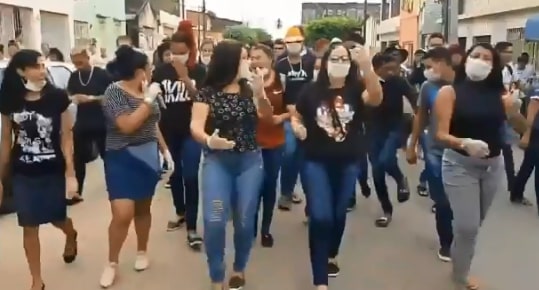 A “passeata contra o coronavírus” reuniu dezenas de pessoas que circularam pelas ruas dançando e cantando uma música com dicas sobre como se prevenir contra a infecção da doença. Apesar de muitos estarem usando máscaras e luvas, é evidente a aglomeração de pessoas.