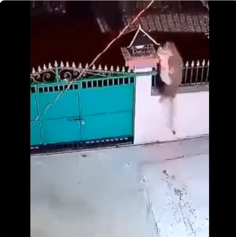 Nas imagens feitas pela câmera de segurança da casa é possível ver o cachorro observando os movimentos do felino. Quando a onça já está do lado de dentro, o animal sai correndo para se esconder. Em outro momento, a câmera filma o felino voltando com o cão na boca, em seguida, pula o muro da casa e desaparece na rua.