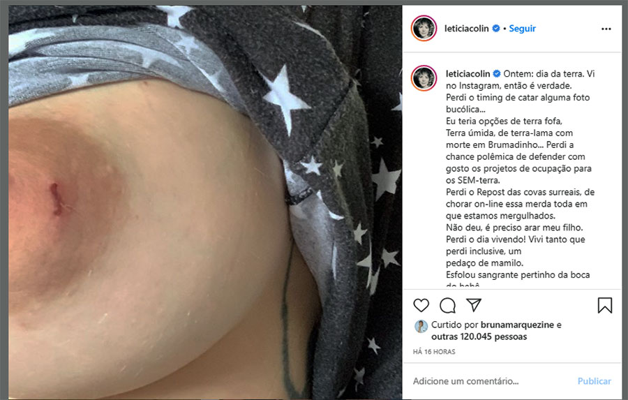 Ela então comentou sobre seu mamilo: “Vivi tanto que perdi inclusive, um pedaço de mamilo. Esfolou sangrante pertinho da boca do bebê. Perdi o fôlego. Que dor do caralho!!! Que momento pra meu filho sorrir bem na minha cara!!! Ele faz de propósito, tenho certeza. “Sabe de nada, inocente…” E foi ardendo, foi ardendo – imaginei a hora do meu chuveiro encontrando o corte, foi ardendo mais…”, relatou.