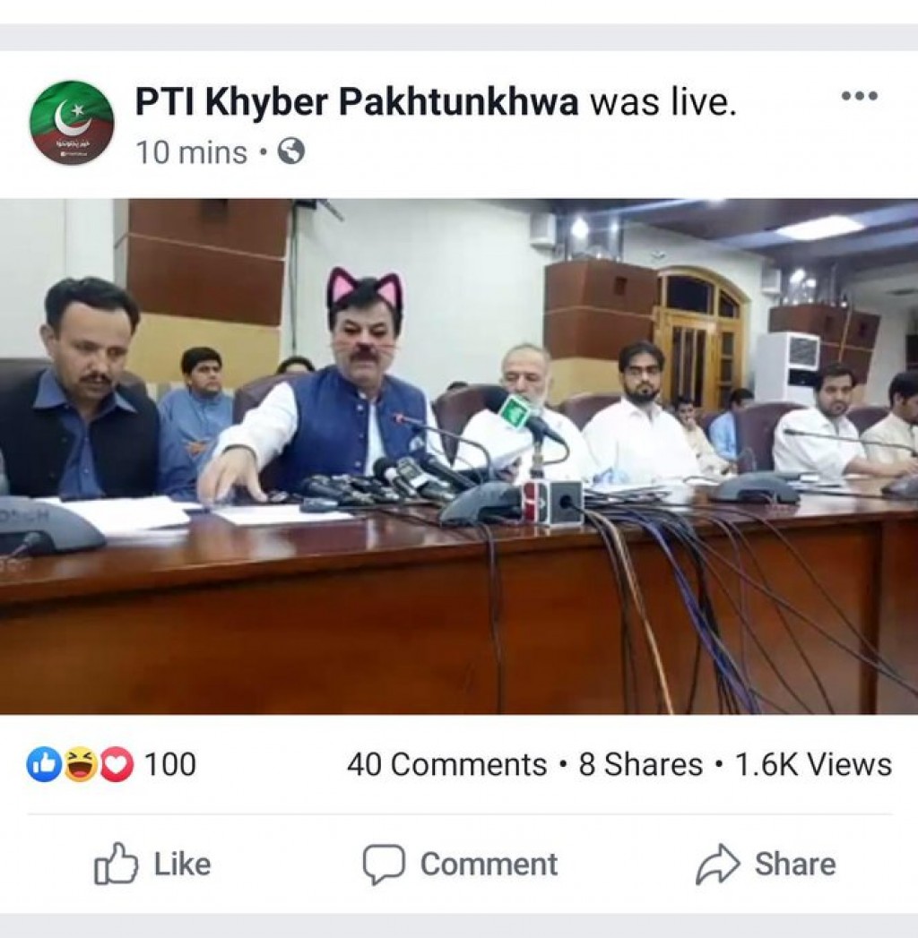 Uma coletiva de imprensa transmitida ao vivo pela página no Facebook de um partido político no Paquistão viralizou nas redes sociais no fim de semana após alguém da equipe ter ativado, por engano, um filtro de gato na última sexta-feira. Com isso, o ministro regional Shaukat Yousafzai apareceu com bigodes e orelhinhas, além de outros dois oficiais do governo.