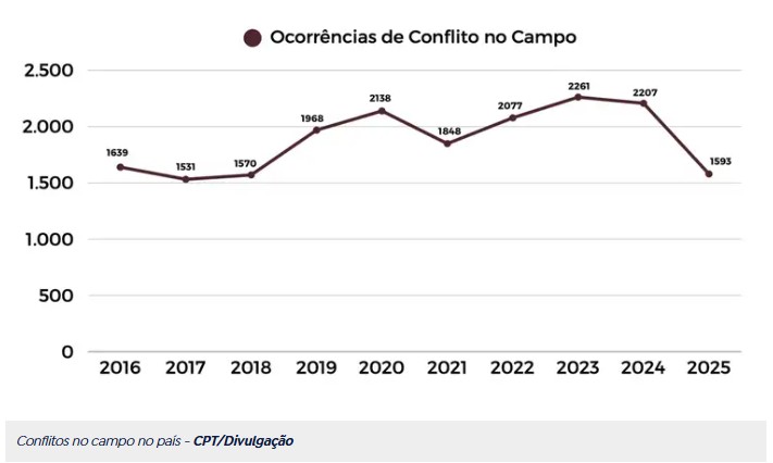 A Comissão Pastoral da Terra (CPT) lançou, nesta segunda-feira (27), a 40ª edição do relatório Conflitos no Campo Brasil. Houve uma queda de 28% nas ocorrências: foram 1.593 em 2025, contra 2.207 em 2024. Porém, os assassinatos de trabalhadores e de povos da terra, das águas e das florestas dobraram: passaram de 13 para 26 vítimas no ano passado.