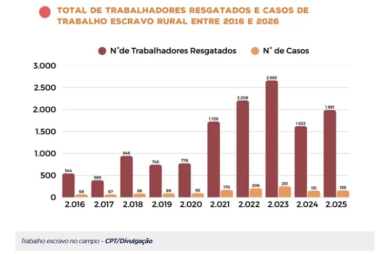 O relatório da CPT indica que houve aumento de 5% nos casos de trabalho escravo ou análogo à escravidão (foram 159 em 2025) e de 23% no total de trabalhadores resgatados nesta condição (1.991).