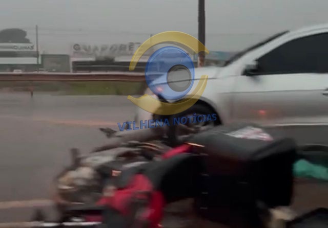 Um acidente envolvendo carro e motocicleta foi registrado na tarde desta sexta-feira (19) na BR-364 em Vilhena, nas proximidades do posto Planalto, no bairro Jardim Eldorado. No momento da colisão, chovia bastante.