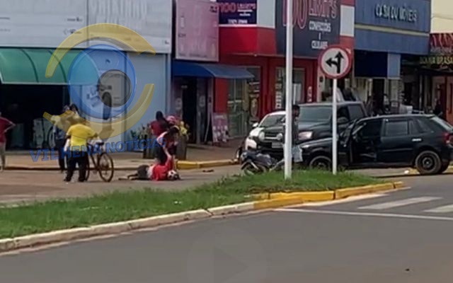 Uma mulher ficou ferida após se envolver em um acidente entre uma motocicleta e um automóvel na tarde desta quarta-feira (26), na avenida Melvin Jones, bairro Cristo Rei, em Vilhena.