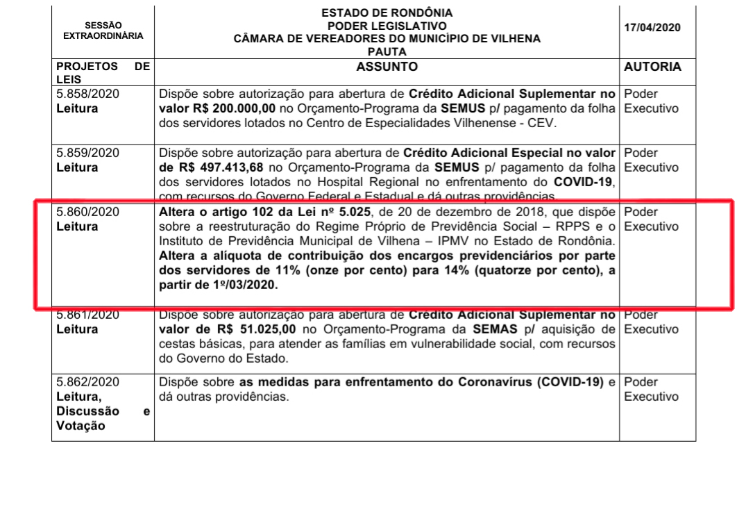 O Projeto até foi para a Câmara, porém, entrou na pauta dos vereadores somente no dia 17 de abril, apenas para leitura (foto). Depois disso, a alteração do Artigo que reestrutura a alíquota de contribuição previdenciária não teve seguimento. Duas outras sessões já foram realizadas pela Casa de Leis vilhenense. De acordo com a assessoria da Câmara o Projeto de Lei nº5.860/2020 foi apenas lido, e neste momento encontra-se nas mãos do setor jurídico.