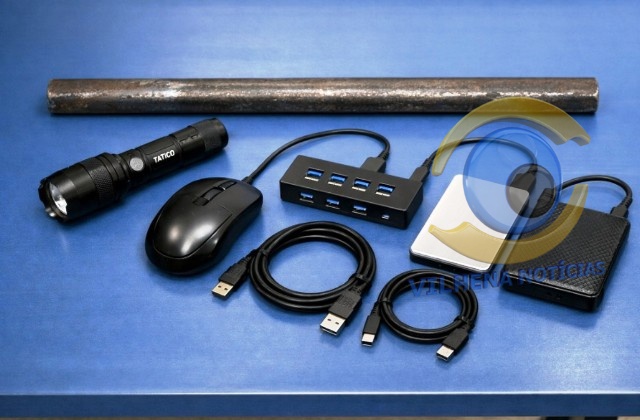 Com os suspeitos, os policiais encontraram uma barra metálica, uma lanterna e diversos itens de informática, incluindo mouse, hub USB e HD externo.