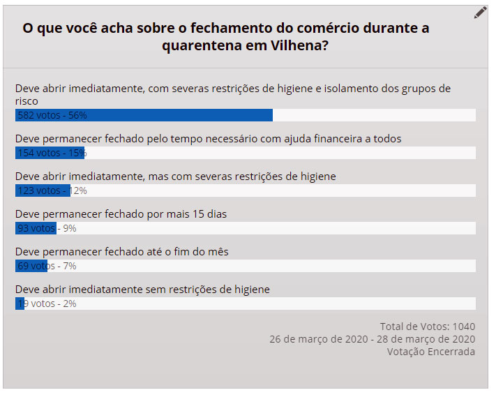 O VILHENA NOTÍCIAS fez uma enquete sobre o que pensavam seus internautas sobre a reabertura do comercio na cidade, e 56% das pessoas que responderam a enquete escolheram a opção: “Deve abrir imediatamente, com severas restrições de higiene e isolamento dos grupos de risco”.