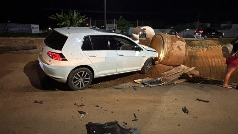 Mesmo com parte da via liberada, o motorista não conseguiu evitar o obstáculo, perdeu o controle da direção e acabou atingindo também algumas manilhas instaladas às margens da estrada.