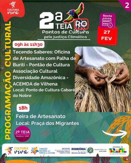 O Pontão de Cultura Associação Cultural, Educação, Meio Ambiente e Desenvolvimento Sustentável Diversidade Amazônica (ACEMDA) realizará gratuitamente a oficina “Tecendo Saberes: Oficina de Artesanato com Palha de Buriti” durante a 2ª Teia RO – Pontos de Cultura pela Justiça Climática, que acontece de 26 de fevereiro a 1º de março, no município de Ji-Paraná.