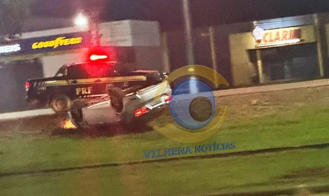 Na noite do último sábado, 18 de abril de 2026, um veículo capotou na BR-364 e foi encontrado tombado às margens da rodovia, no canteiro central que divide a via com a avenida Celso Mazutti, no bairro Jardim América, em Vilhena.