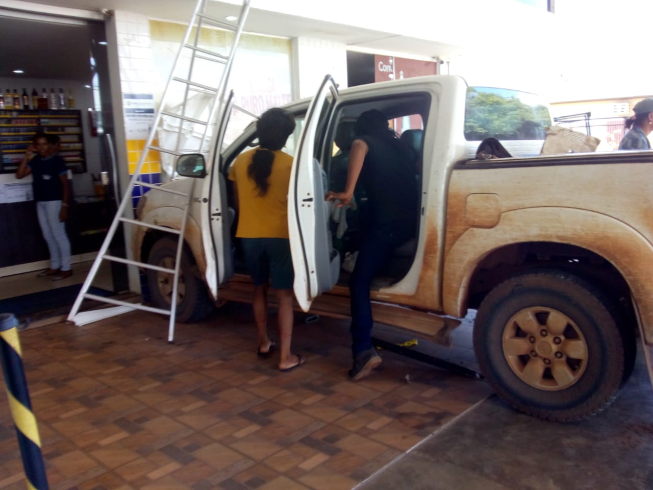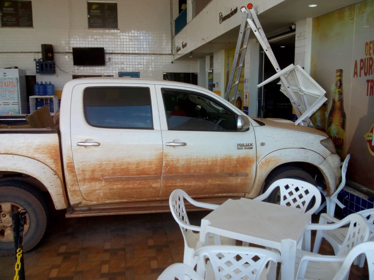 Uma pick-up modelo Hilux desgovernada bateu na parede da loja de conveniência do posto de combustível Santo Ângelo, em Vilhena, na manhã desta sexta-feira, 31 de janeiro. Um trabalhador que fazia manutenção no local quase foi atingido. Ele estava em cima de uma escada e pulou antes que fosse atingido.