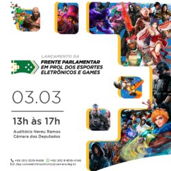 No próximo dia 03 de março de 2020 haverá o lançamento da FRENTE PARLAMENTAR EM PROL DOS ESPORTES ELETRÔNICOS E GAMES no auditório Nereu Ramos, na Câmara dos Deputados em Brasília. O evento acontecerá das 13h às 17h.