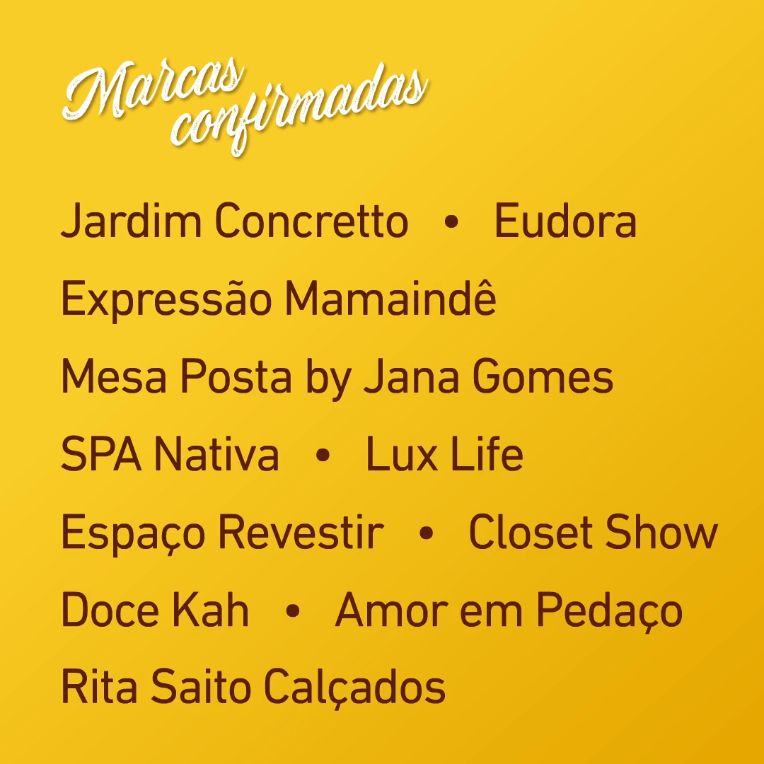A feira reúne produtos de decoração, artesanato, moda, gastronomia e muito mais. As marcas presentes são Expressão Mamaindê, Jardim Concretto, Mesa Posta by Jana Gomes, Eudora, SPA Nativa, Espaço Revestir, Closet Show, Spa Nativa Terapias Naturais, Lux Life, Doce Kah e Amor em Pedaço.