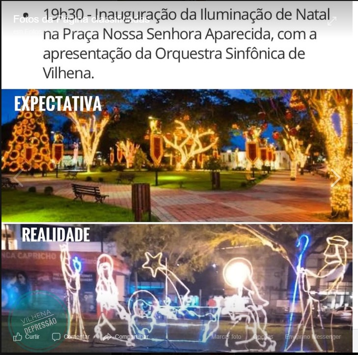 Todos os anos a decoração natalina de Vilhena gera polêmica na internet. Dessa vez, a página “Vilhena Depressão” no Facebook fez uma montagem ao estilo “Expectativa-x-Realidade” sobre os enfeites de Natal na cidade.