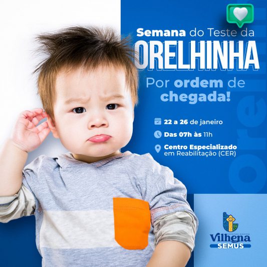 A Secretaria Municipal de Saúde (Semus), promoverá um período de cinco dias dedicados à realização de Testes da Orelhinha para crianças de até três meses de idade. Essa iniciativa acontecerá no Centro Especializado em Reabilitação (CER) de 22 a 26 de janeiro de 2024, no horário das 7h às 11h.