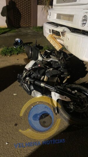Com isso, a moto acabou colidindo violentamente contra a parte frontal de um caminhão que estava estacionado na via.