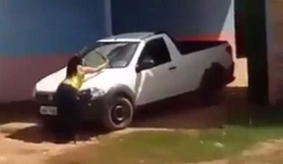 No vídeo é possível ver que a esposa traída se prostra em frente ao carro, enquanto faz xingamentos ao marido. Em seguida, ela tenta quebrar o vidro do carro com socos e por fim consegue quebrá-lo com limpador de para-brisas.
