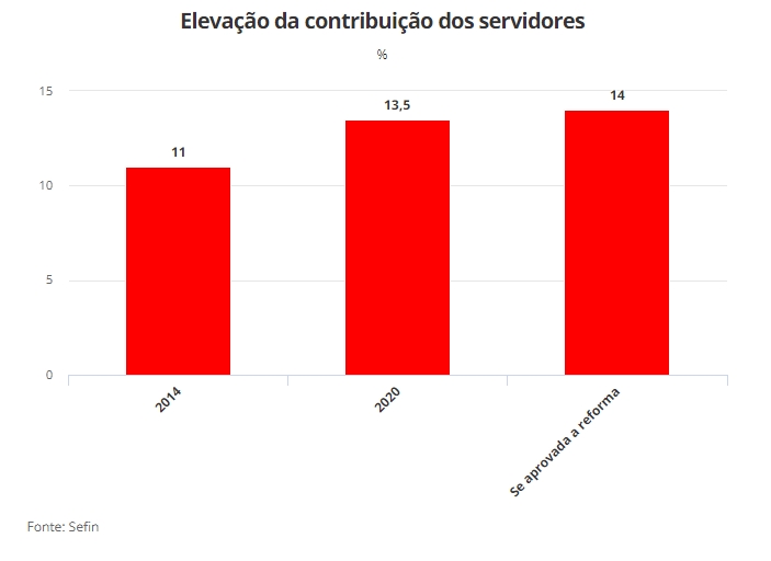 Com a reforma, a contribuição patronal (do estado) passa para 16% em 2020, progredindo até 18% em 2022. E os servidores passariam a dar 14% de seus salários à previdência.